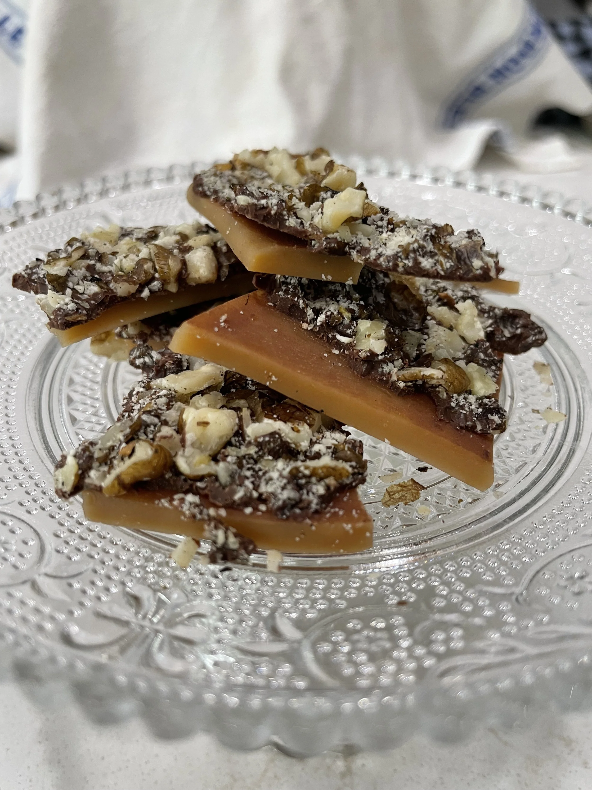 INGREDIENTS: butter, sugar, black walnuts, chocolate, soy lecithin, cocoa butter, milkfat & salt.